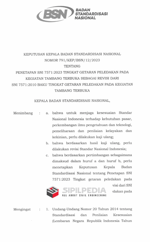 KEPUTUSAN KEPALA BADAN STANDARDISASI NASIONAL NOMOR 791/KEP/BSN/12/2023 TENTANG PENETAPAN SNI 7571:2023 TINGKAT GETARAN PELEDAKAN PADA KEGIATAN TAMBANG TERBUKA SEBAGAI REVISI DARI SNI 7571:2010 BAKU TINGKAT GETARAN PELEDAKAN PADA KEGIATAN TAMBANG TERBUKA