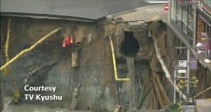 Huge sinkhole swallows street in Fukuoka, Japan